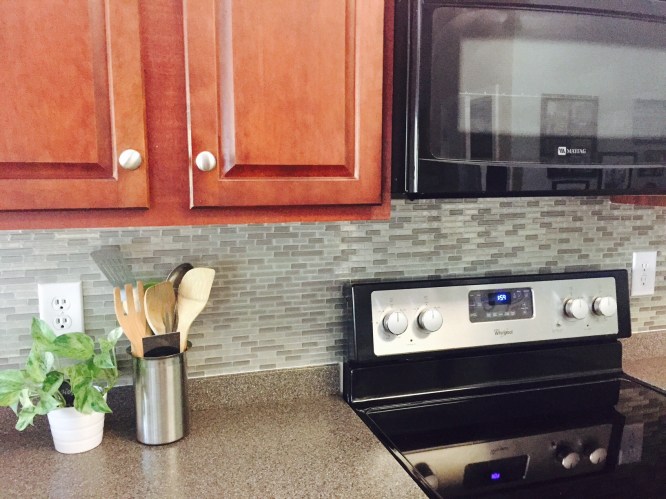 Last weekend I decided it was time to revamp my kitchen and I wanted to start by doing a tile back splash. Neither my husband or I are very “handy,” and by that I mean our tool box is not a box at all but rather a small duffel bag. The thought of grout and a wet saw was a bit overwhelming. I had almost given up until I came across these Smart Tiles at Home Depot. I will be honest…at between $6.97 and around $10.00 for a 9.7 x 10.95 in. wall tile they are not much cheaper than the real thing. What they do offer, however, is a quick and easy makeover with little to no mess and I was super impressed by the results.